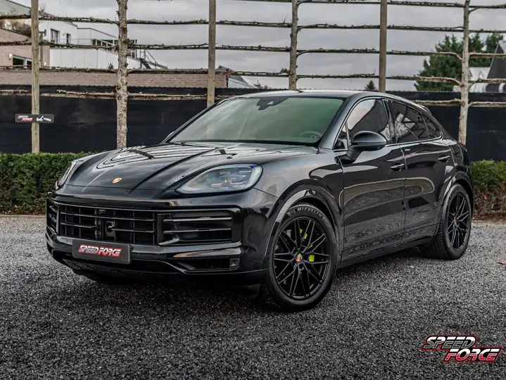 De diepzwarte Porsche Cayenne Coupé oogt strak, krachtig en atletisch. De aflopende daklijn en gespierde houding geven hem een agressieve, sportieve uitstraling die direct snelheid en luxe uitstraalt.