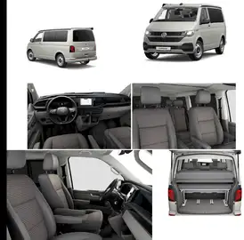 7 Sitze 1. u. 2. Reihe drehbar; 8fach bereift Sommerräder auf Alu schwarz.Aufstelldach mit 3 Öffnungen, Frontfenster komplett zum Öffnen. Markise schwarz. 2 Klappstühle u. 1 Klapptisch. Standheizung. Ringsum Verdunklungsrollos.